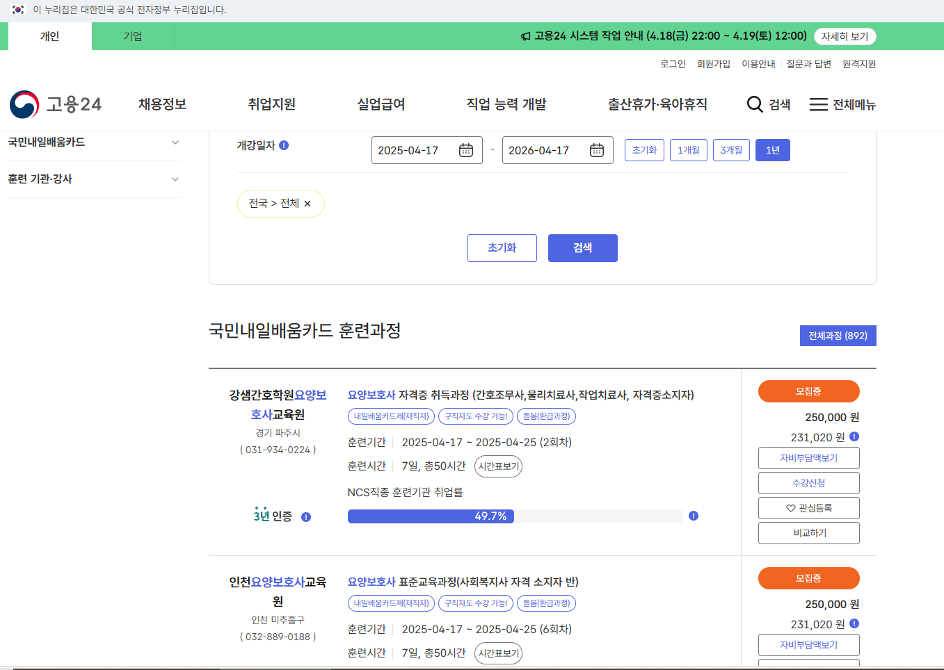 2. 카드를 발급했다면, 요양보호사 교육과정을 검색한다.