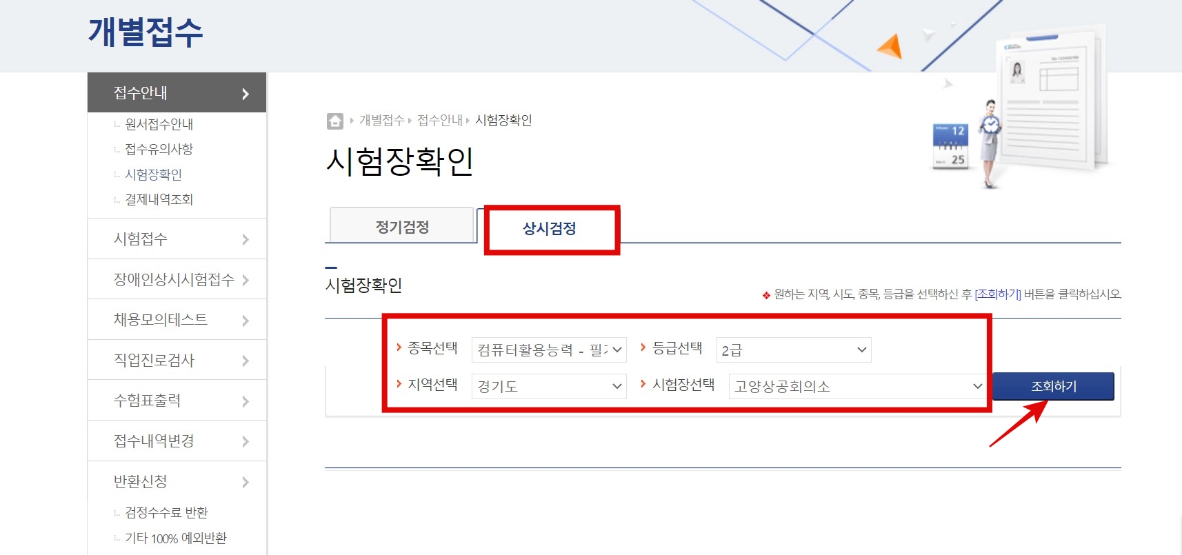 3. 시험장 확인을 클릭하여 "상시 검정" 탭을 누르면 종목선택, 등급선택, 지연선택, 시험장선택을 한 후 → 조회하기를 클릭한다. 그럼 날짜별로 시험시간을 확인할 수 있다.