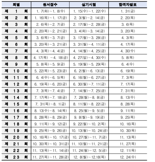 1. 연중 상시 시행 : 월요일 ~ 금요일까지 주중 시행을 원칙으로 한다. 단, 시행기행 내에 토요일, 일요일, 공휴일은 시험이 운영되지 않을 수 있으니 참고한다.