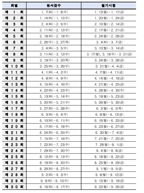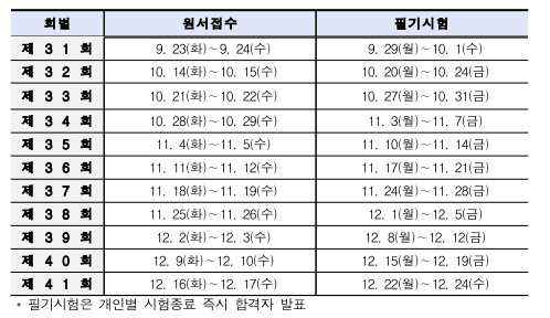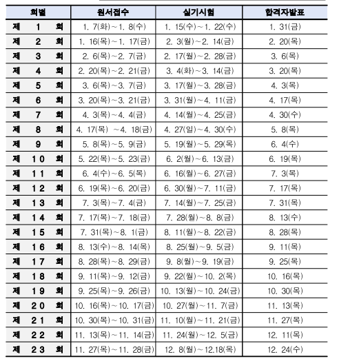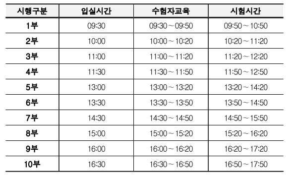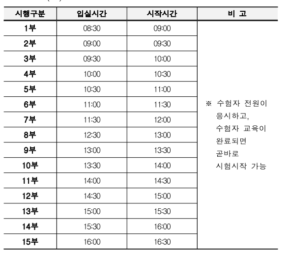 1. 시행 일정 : 월요일부터 금요일까지 주중에 시행하는 것을 원칙으로 하며 시행 기간 중에 토요일, 일요일, 공휴일은 시험이 운영되지 않을 수 있다.