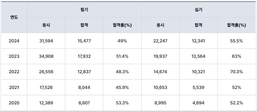➡ 최근 몇 년간의 합격률은 다음과 같습니다. 두명중 한 명은 합격하는 수준입니다. 필기시험은 과목이 많아 암기량이 많고 실기시험은 실제 응용력과 논리적인 사고가 중요합니다.