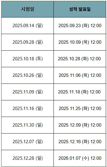 ➡ 12월 마지막 시험은 12월 28일로 성적발표가 2026년으로 넘어가게 됩니다. 즉, 2025년도 안에 성적 확인이 필요하신 분들은 12월 7일 시험을 꼭 치러야 합니다.