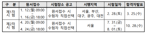 • 합격자 발표까지는 한 달 정도 소요되며 이후 바로 2차 준비가 이어지기 때문에 1차와 2차 시험을 병행하는 전략이 필요합니다.