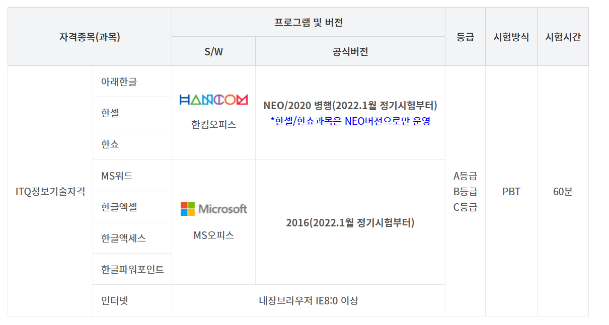 • 2020년 3월 31일 이전에 ITQ 자격증을 취득한 사람이라면 국가공인 민간 자격 효력이 만료되지 않고 평생 유효하다.