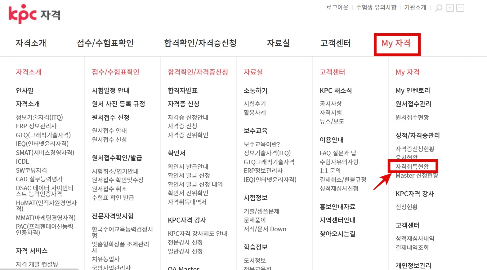2. 로그인을 한 후 마이자격에서 "자격 취득 현황"을 클릭하면 바로 확인이 가능하다. (자격증 신청도 가능!)